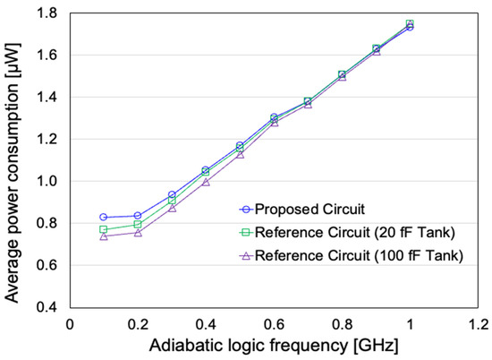 The proposed system was compared to the reference driver circuit in Figure 5. First an implementation of the reference driver circuit was designed using minimum sized FinFET parameters and two fins per device. Control signals were also created using ideal voltage sources. This is to keep consistency with the proposed driver implementation. Then, a sweep of the tank capacitor for each driver was performed to confirm the findings laid out in [7], each of the four drivers receiving identical capacitance values. The reference drivers were attached to each clock phase for the test logic circuit and driven to result in an adiabatic logic frequency of 250 MHz. Average power consumption was then computed for these simulations. These results can be seen in Figure 8. After a tank capacitance of 20 fF, savings in power suffers from significant diminishing returns. Therefore, 20 fF was chosen as the baseline for tank capacitor in the reference driver circuit, with 100 fF being used as an extreme to compare efficiency with the proposed driver circuit. In all reference driver simulations, tank capacitors were pre-charged to 0.4 V in order to model the circuit having reach its steady state of operation, with the goal being to mimic the “few cycles to settle” requirement laid out in [7]. Simulations for each circuit were then performed at a range of adiabatic system frequencies (100 MHz to 1 GHz), and power consumption for each system (proposed, reference at 20 fF, and reference at 100 fF) was calculated.