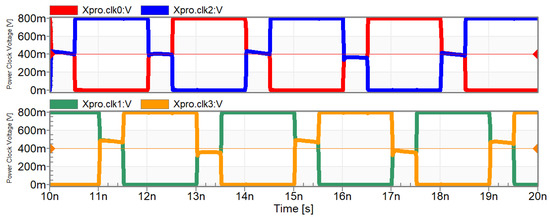 All test logic circuits adequately performed the logical operations required under their respective drivers, confirming that both methods are sufficient for proper logical operation. Power consumption across the frequency range for each driver is shown in Figure 9. As can be seen, across the majority of the frequency range, both the 20 fF reference driver, the 100 fF reference driver, and the proposed driver perform within 1% of each other with regard to power consumption. Lower frequencies slightly deviate from each other as these ranges are more dominated by leakage power rather than the dynamic switching power. Additionally, when observing the waveforms of the clocks in Figure 10 for the proposed driver, the mismatch in load between the phases can be seen. and are relatively well balanced, and their step voltages do not deviate far from during either charging or discharging. This can be explained by the relatively even load for each phase based on the logic used in Figure 7. and , however, show a deviation to about 480 mV at the worst in a given charge or discharge cycle. Again, by looking at Figure 7, it is easy to see that the load seen by is the lowest in the circuit, as the outputs of logic gates driven by do not drive any other gates, only their self-loading is present. Adding dummy load to clock 3 in the form of capacitor connected NFETs allowed for the step voltage to reach closer to the ideal of , in agreement with (2) and the reduction in α to be closer to 1, but overall increased the power consumed by the circuit in agreement with the findings in (11) and (12).