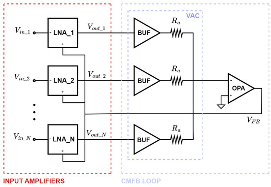 The CMFB consists of a voltage-averaging circuit and an error amplifier. In relation to the single recording channel, the former is composed of a voltage buffer, necessary to eliminate the loading effect to the main amplifier, and a resistor . Assuming the same value for all 16 resistors, the voltage fed to the inverting input of the error amplifier can be expressed as follows: