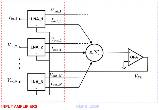 To address this limitation, we devised a variation of the aforementioned front end, designed with the aim of significantly reducing its area occupation without compromising the system’s performance. As depicted in the block diagram in Figure 2, this modified version of the front end maintains the same number of recording channels. Its distinctive feature lies in the operation mode of the CMFB loop: in place of the mean calculation of the output voltages, a sum of the output currents is conducted instead.