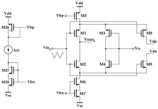 Biasing of the amplifier is achieved through the voltages and applied to the gates of transistors M5 and M6–M7, which, respectively, act as a current source and a current sink for the inverter. Concerning the pair M6–M7 in particular, connecting the gate nodes and the body nodes of the two transistors allows us to virtually obtain a transistor with a channel length capable of exceeding the upper limit set by the specific adopted technology [35].