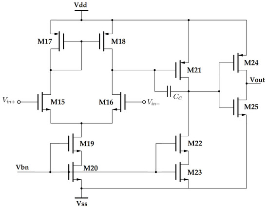The second stage of the amplifier is made up of a common-source transistor, M21, biased through the composite transistors M22–M23. A compensation feedback capacitor is connected between the drain and the gate of M21 to ensure the stability of the amplifier, as well as to provide a sufficient gain bandwidth product according to the following formula [36]: