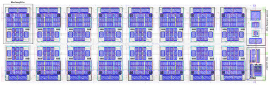 The layout of the analog front end is depicted in Figure 9, showing the 16-pixel amplifiers, each with an area footprint of 50 m × 65 m, placed along two rows. Utilizing six metal layers, this compact layout encompasses all the transistors described in detail in Section 3. Notably, the smaller transistors (M8–M9 in Figure 3), responsible for replicating the scaled currents, are surrounded by the transistors of the main inverter and the feedback transistors to mitigate potential mismatch between the devices. Overall, the area occupation per channel is lower than 0.004 mm2.