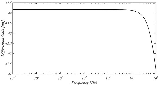 As shown in Figure 11, further simulations revealed a favorable SCMRR of 80.5 dB at low frequencies. Particularly noteworthy was the performance of the front end within the range between 0.1 Hz and 100 Hz, where the SCMRR maintained a value of at least 80 dB. A moderately high level of rejection was maintained at higher frequencies, with the SCMRR exceeding 60 dB up to a frequency of 2 kHz.