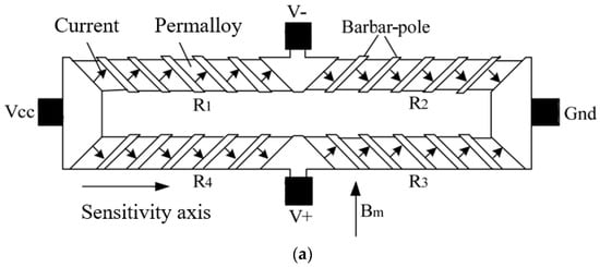 The AMR sensor shows the advantages of a small size, low power consumption and high reliability [38]. Commonly, in the AMR sensor, PoMo alloy magneto-resistive strips based on the Baber pole structure are organized in the structure of a Wheatstone bridge, as shown in Figure 8a. When Bm = 0, R1 = R2 = R3 = R4 = R0. So, the output voltage of the Wheatstone bridge is zero. If Bm is not zero, since the Baber electrode angles of R1 and R4 are the same, both of their resistances are decreased at the same time. Meanwhile, the Baber electrode angles of R2 and R3 are the same, but opposite to those of R1 and R4, so both of their resistances are increased at the same time. So, the output voltage is: