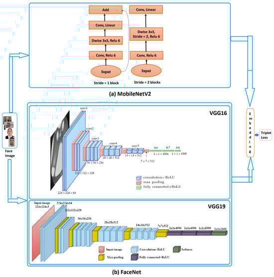 The architecture of the MobileNetV2 technique (a) and the architecture of VGG16 and VGG19 of the FaceNet technique (b).