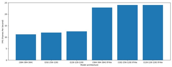 Performance of the different models in FPS, where the FPS results are the average FPS of 100 recorded frames. Three different custom-made tops were used to test the proposed performance using the custom-trained CNN with MobileNetV2. The first top has three hidden layers with 384 neurons each, making it the largest custom-made top for MobileNetV2 in this example (384-384-384). The second top, with a configuration of 192-256-128, is the second largest custom-made top. The third top, with a configuration of 128-128-128, is the smallest custom-made top. Additionally, TensorFlow-lite quantization was applied to all three networks.
