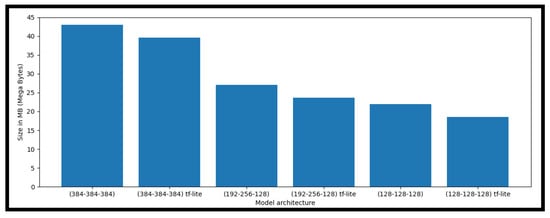 Additionally, the process of squeezing a model is employed to streamline its architecture by reducing the number of layers, neurons, or both until it achieves acceptable accuracy or meets specified criteria related to size, inference speed, or memory consumption. The optimization methods discussed present various custom-designed configurations for MobileNetV2: the largest model consists of three layers, each with 384 neurons; an intermediate size configuration such as (192-256-128); and the smallest with (128-128-128). TensorFlow-Lite quantization is applied to all three networks.