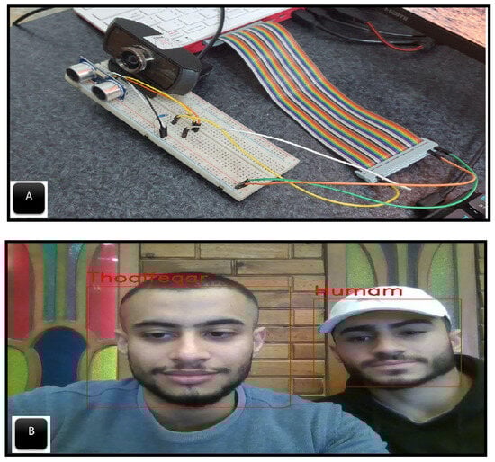The hardware design. (A) Example of the hardware connection. The hardware system combines an ultrasonic sensor and webcam to measure and monitor subject distance, capturing images for face recognition. Optimal recognition occurs at distances below 80 cm, with lower confidence beyond that, signaled on the GUI. (B) An instance of the system operating with two subjects is evident. The system accurately identifies the faces of Thoalfeqar and Humam. Both serve as representatives of the fourth class in the Department of Computer Engineering at Mustansiriyah University. Typically, class representatives, including Thoalfeqar and Humam, have access to the department’s rapporteur room along with the department’s staff.