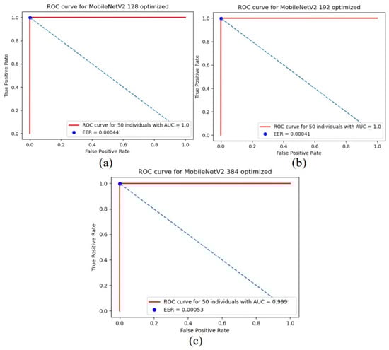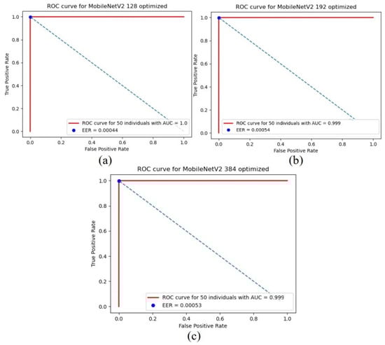 Figure 6 illustrates the receiver operating characteristic (ROC) without optimization for the custom-trained CNN utilizing MobileNetV2 and MLP classifiers for three variations in customs: (a) (128-128-128) custom top, (b) (192-256-128) custom top, and (c) (384-384-384) custom top.