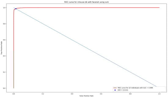 The FaceNet model is pre-trained by the LFW dataset. Utilizing the SVM classifier, the FaceNet approach is applied to an in-house database that has 24,300 photos taken by 10 different subjects with a high-resolution smartphone camera. Figure 8 demonstrates the ROC curve for the proposed FaceNet with SVM classifier. Different classification methods can be employed [,,], but the algorithms proposed in the study are highlighted for their successful effect to improve the system performance as shown in this section.