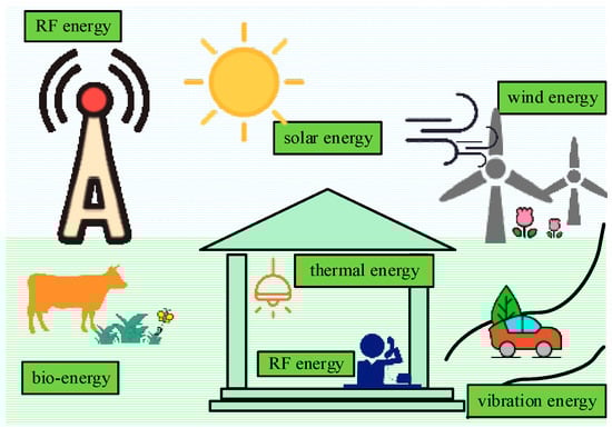 Research has demonstrated that energy harvesting systems can capture energy from various widely available sources, including solar, vibration, electromagnetic (RF), and thermal energy, as illustrated in Figure 1.