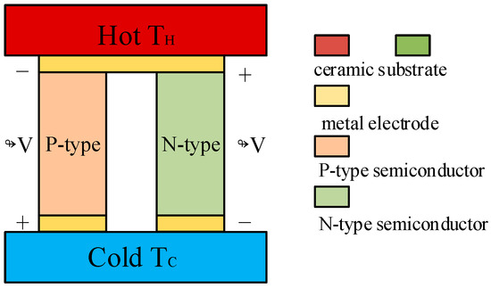 Thermal energy is extensively employed in remote power applications [28,29], where the Seebeck effect and the Poincaré effect are utilized for power conversion, as shown in Figure 3. When there is a temperature difference across the substrate of the TEG, holes in the p-type semiconductor and electrons in the n-type semiconductor move from the hot side to the cold side, creating a voltage difference ΔV between the metal electrodes: