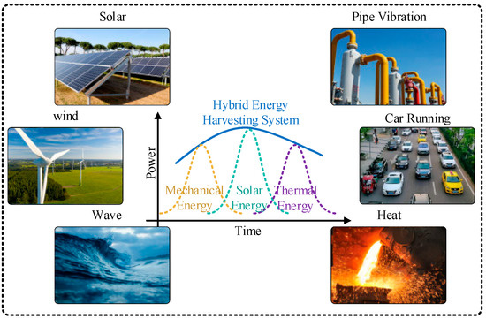 A multi-source energy system integrates various harvested energy sources, combining their advantages, as illustrated in Figure 8. By utilizing multiple energy sources, the multi-source energy harvesting strategy can enhance energy utilization efficiency.