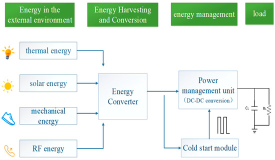 Recently, energy harvesting technology has been proposed to collect and store previously untapped sources of environmental energy. The harvested energy can be stored and be applied to specific appliances, such as human body implanted devices and sensor networks without an energy supply [2,3]. Energy sources for harvesting include piezoelectric, triboelectric, electromagnetic, electrostatic, thermoelectric, and light/solar energy [4]. To convert the above-mentioned scattered energy into stored electrical energy, different approaches can be applied. For example, electrostatic, triboelectric, and electromagnetic energy can be converted by frictional contact. Piezoelectric methods employ active materials to convert mechanical strain into electrical energy. Heat generated from industrial production [5] or human activity [6] is also an important source of energy harvesting. In addition, a design method for capacitor-based energy harvesting systems has been proposed that utilizes switches to implement a pulsed harvesting system, maximizing the utilization efficiency of the storage capacitor during transients, making it functional for radio frequency energy harvesting (RFEH) applications [7]. In summary, the diversity of these energy harvesting strategies presents complex systematic considerations for their design in order to meet whole system requirements in different scenarios.