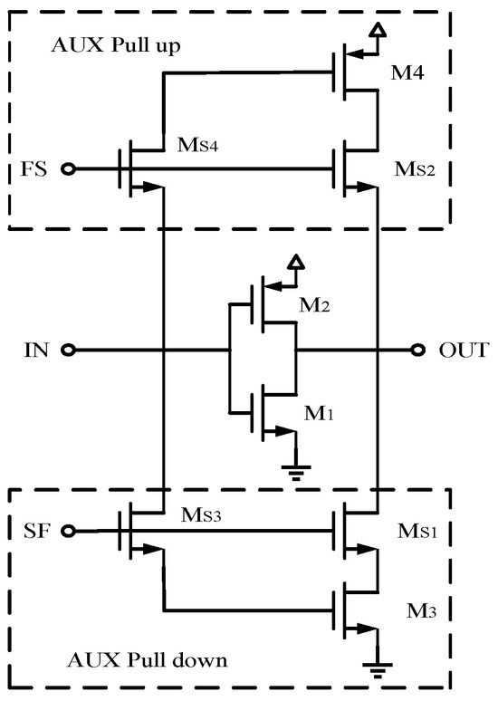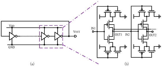 A ring oscillator that is designed to start at low voltages employs dynamically biased delay elements with low-voltage characteristics [63], as shown in Figure 17. A low-voltage level shifter (VLS) increases the range of voltage used to bias the delay element. When the supply voltage drops to 24 mV, the cold-start ring oscillator operates continuously at room temperature. M. Nishi et al. proposed a ring oscillator (ROSC) tailored for thermoelectric energy generators operating at extremely low voltages [64]. As shown in Figure 18, the designed ROSC consists of a stacked inverter (SI) and a conventional self-bias inverter (SBI). For a conventional inverter, the maximum value of the voltage gain |AINV| is