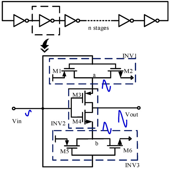 To stabilize the ring oscillator and ensure compatibility with standard CMOS technology, researchers have constructed them using an intrinsic transistor [48]. In 2015, Ashraf et al. suggested a comprehensive energy-harvesting power supply for implantable pacemakers, as shown in Figure 13 [61]. A forward body bias reduces the initial activation voltage of the ring oscillator, enabling the circuit to be started at 60 mV. Unfortunately, operating the ring oscillator across different process corners has proven unfeasible. In 2018, Dezyani M. et al. introduced a thermoelectric energy harvesting system featuring a new process-tolerant inverter unit [53], implemented as a ring oscillator in Figure 14. The oscillator incorporates traditional inverters combined with additional circuitry, ensuring successful operation across various process corners. This approach eliminates the need for post-fabrication adjustments or trimming, while remaining compatible with standard CMOS technology. The harvesting system can be operated with an input voltage as low as 60 mV, generating 4.5 μW of output power. Soumya Bose et al. developed a modified ring oscillator architecture, shown in Figure 15 [56]. The input signal Vin is amplified to be Va at node a by the inverter INV1, and is amplified to be Vb at node b by the inverter INV3. The equivalent input signal for M3 is Vin (1 + A1), where A1 is the gain of the inverter INV1. Similarly, the input signal for M4 is Vin (1 + A3), where A3 is the gain of inverter INV3. As a result, the effective trans-conductance Gm is