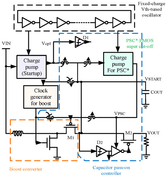 - Bose, S.; Anand, T.; Johnston, M.L. Integrated Cold-start of a Boost Converter at 57 mV Using Cross-Coupled Complementary Charge Pumps and Ultra-Low-Voltage Ring Oscillator. IEEE J. Solid-State Circuits 2019, 54, 2867–2878. [Google Scholar] [CrossRef]