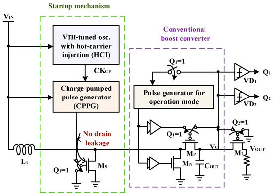 The improved conversion efficiency is crucial for energy harvesting systems, as it reduces energy loss, extends battery life, and enhances system performance. A 95-mV start-up boost converter [51], as shown in Figure 19, was reported by PH Chen et al. in 2011, achieving a conversion efficiency of 72%. Energy harvesting systems based on this technique become more applicable when mechanical switches and external clocks are eliminated. Additionally, the design shows the feasibility of the minimum start-up voltage for the on-chip ring oscillator. In 2012, a dual-mode boost converter for energy harvesting systems was proposed [67], as shown in Figure 20. The converter employs an inductive boost DC-DC converter for both start-up and operational modes, utilizing a charge-pump pulse generator (CPPG) to drive the power transistor. The system can be started with an ultra-low voltage of 80 mV in 4.8 ms. A maximum conversion efficiency of 72% is achieved at an output current of 0.5 mA.