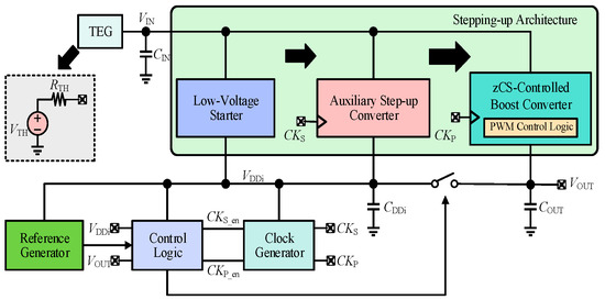 - Luo, Z.; Zeng, L.; Lau, B.; Lian, Y.; Heng, C.H. A sub-10 mV power converter with fully integrated self-start, MPPT, and ZCS control for thermoelectric energy harvesting. IEEE Trans. Circuits Syst. I Regul. Pap. 2017, 65, 1744–1757. [Google Scholar] [CrossRef]