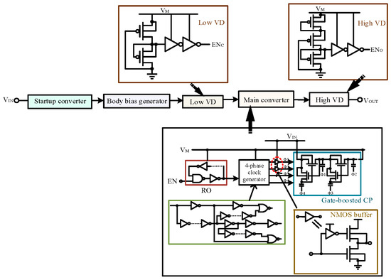 - Fuketa, H.; Matsukawa, T. Fully integrated, 100-mV minimum input voltage converter with gate-boosted charge pump kick-started by LC oscillator for energy harvesting. IEEE Trans. Circuits Syst. II Express Briefs 2016, 64, 392–396. [Google Scholar] [CrossRef]