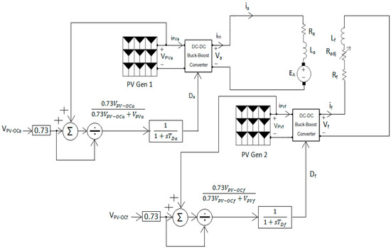 The voltage controllers for the armature and field circuits of the SEDC motor are shown in Figure 1. These controllers are designed to manage the voltage in their respective circuits by utilizing fractional open-circuit voltage values from the PV generator. This method ensures optimal performance under various motor loading conditions and different levels of solar irradiance, facilitating MPPT through the automatic adjustment of each DC-DC buck–boost converter’s duty cycle. The behaviour of the voltage controllers for both the armature and field circuits can be represented as follows: