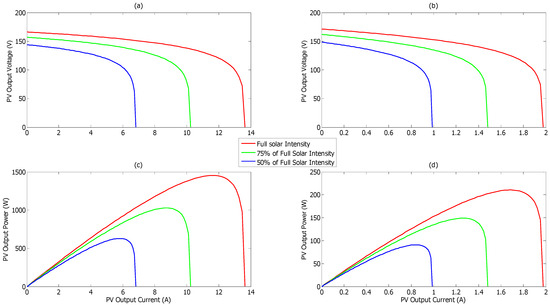 PV generators’ characteristics for feeding armature and field circuits: (a) terminal output voltage as a function of PV current for the armature, (b) terminal output voltage as a function of PV current for the field, (c) corresponding output power for PV feeding armature, and (d) corresponding output power for PV feeding field.
