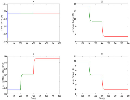 - The numerical values for the system’s parameters are as follows: Lf = 10 mH, Rf = 120 Ω, V = 120 V, LA = 18 mH, RA = 0.24 Ω, J = 15 kg·m2, TDa = 1 ms, and TDf = 0.1 ms.