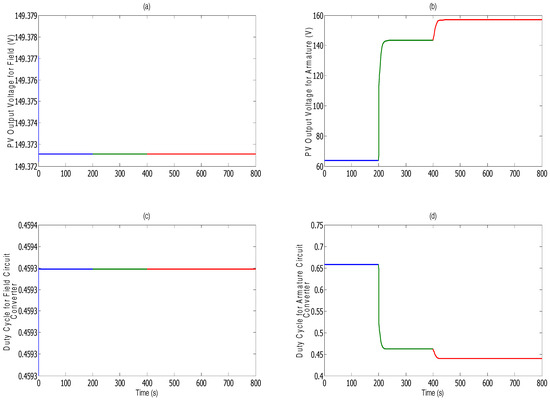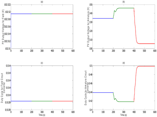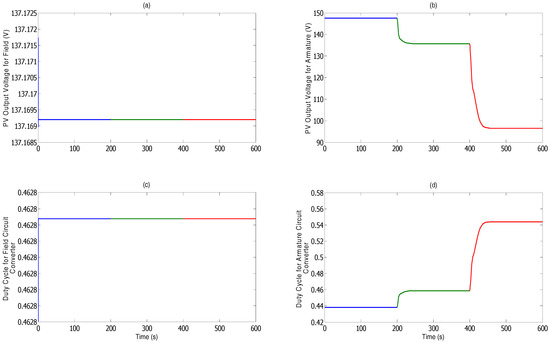 The PV output voltage feeds the (a) field circuit and (b) armature circuit, along with the duty cycle for the buck–boost converter for the (c) field circuit and (d) armature circuit, after step changes in loads under full irradiance.