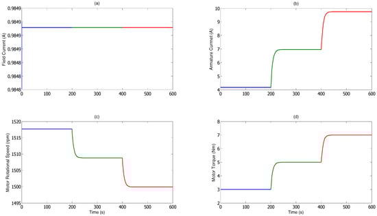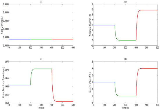 Motor, (a) field current, (b) armature current, (c) rotational speed, and (d) torque following step changes in mechanical loads at 50% of full solar irradiance.