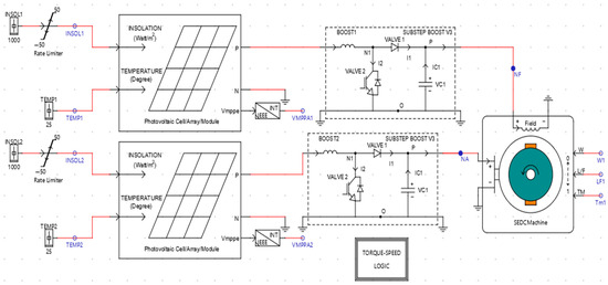 The output current from the converters, assuming an ideal converter circuit, can be defined as a function of the currents. Equation (11) represents the motor armature current () of the buck–boost at the armature circuit based on the armature current fed from the PV generator (), while Equation (12) describes the motor field current () based on the field current fed from its PV generator ().