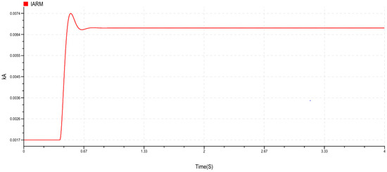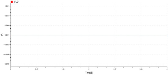 The following figures provide an in-depth analysis of the dynamic behaviour of a separately excited DC motor under different solar irradiance levels (100%, 75%, and 50%), utilizing a Real-Time Digital Simulator (RTDS). This system creates a real-time simulation environment that effectively replicates the actual behaviour of electrical systems during dynamic transient operating conditions. In these RTDS validation analyses, the system operates with a torque of 5 N.m, and the motor parameters, including armature current, field current, armature voltage, field voltage, and rotational speed, are recorded at each irradiance level. Figure 11 illustrates the armature current of 6.8 A by the armature circuit when the load torque is suddenly adjusted to 5 N.m at 100% irradiance level. The field current of 1.1 A by the field circuit at the same condition, as shown in Figure 12.