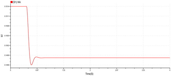 Figure 7 and Figure 8 show the system’s response under 50% of full solar intensity, showcasing the effects of step changes in the from 2 N.m to 0 N.m (No Load) and then to 4 N.m. In the first step, at 2 N.m, the motor operates at 1461 rpm with a duty cycle of 0.4388. Upon reducing the load to 0 N.m, the motor’s steady-state speed increases to 1471 rpm, accompanied by a converter duty cycle of 0.4181. Subsequently, increasing the torque to 4 N.m yields a speed of 1451 rpm and a duty cycle of 0.4986. To maintain the MPP of the PVs at 50% of full intensity (105.5 V), adjustments are made to the buck–boost converter’s duty cycle in the armature circuit. The PV output terminal voltages supplying the armature circuit of the motor measure 134.2 V, 146 V, and 105.5 V after the load torque decreases from 2 N.m to 0 N.m and then increases to 4 N.m, respectively. The simulations indicate that the armature current of the SEDC motor varies from 2.936 A to 0 A to 5.872 A under these fluctuating load conditions. Meanwhile, the terminal output voltage of the PV generator supplying the field circuit is maintained at 102.5 V, with a converter duty cycle of 0.514. Throughout all load conditions, the motor’s terminal voltage remains constant, consistent with the fractional open-circuit voltage values of the PV generators at 50% of full solar irradiance levels supplying both the armature and field circuits. These values align with the predetermined values of the armature and field voltage controllers. The settling time of the system under 50% of full solar intensity is approximately 65 s, indicating a relatively swift response to changes in solar irradiance. This behaviour highlights the system’s versatility and efficiency in utilizing solar energy for motor operation across various conditions.