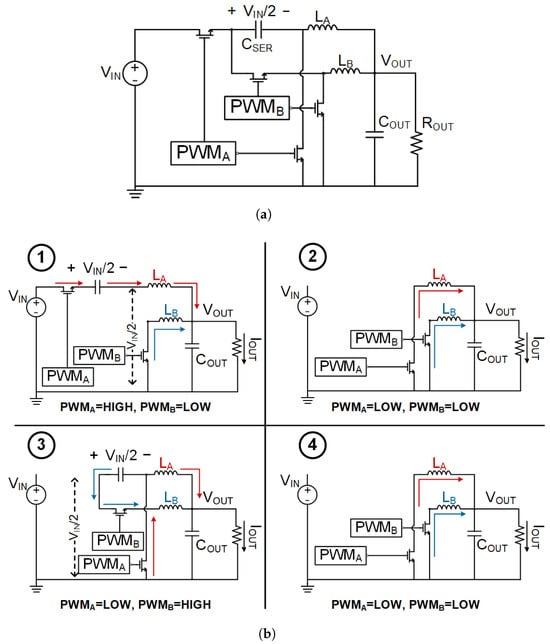 (a) The double step-down buck converter architecture and (b) its 4 control phases, with red and blue arrows indicating and sub-converter current flow respectively.