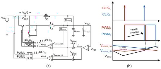 (a) Peak current mode (PCM) control of DSD buck converter using 2 autonomous sub-converters and (b) phase overlap from current mismatch.