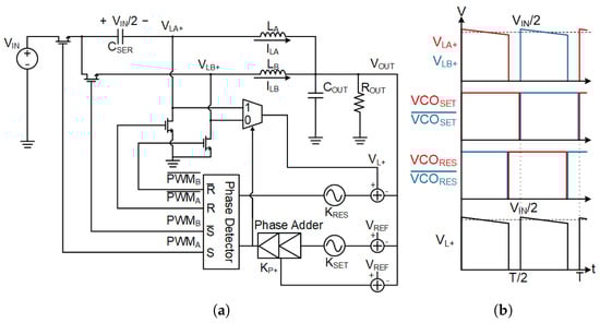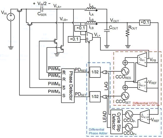 is generally smaller than (9) purports in real VCDLs, as inverters have a minimum propagation delay. As such, should a time-based controller require a large proportional gain response to adequately compensate its closed loop, a fixed time delay of more than half the maximum delay error would be used, severely impacting the response time of the controller to transients, where a slow controller response would cascade into destabilizing the DC–DC converter, as the PWM duty cycle produced is responding to an output voltage state from multiple cycles ago rather than its current state. Time-based controllers in [,,] mitigate this issue by operating the controller at high frequencies of 10 MHz to 25 MHz, where the required time delay for large proportional phase gain is much shorter. This restricts the application of time-based control to small, low-power, and minimal voltage conversion ratio applications, as switching losses are kept minimal when operating power regulators at high switching frequency in those applications. For slower switching frequency DC–DC converters, reference [] introduced an infinite phase delay line to keep the time delay to a maximum of one oscillator cycle, and delays exceeding that simply skip that oscillator cycle entirely. This method, however, is incompatible with the DSD architecture as its current sharing feature [] is only active when the controller consistently switches between the two sub-converter phases, allowing the series capacitor to share the stored charged between the two stages when current imbalances occur, and cycle skipping would compromise that during transient conditions. Hence, a proportional phase gain controller is introduced in this paper as a replacement to the VCDL, where the VCO signals are pulled forward differentially rather than delayed in proportion to the error voltage, so as to minimize the propagation delay between feedback and PWM signal.