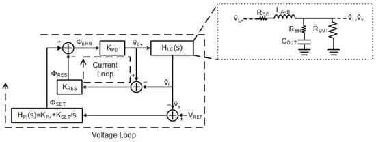 where and are the parasitic resistances of the inductors and and the equivalent series resistance of the capacitor , respectively, and , with the multiplexer in the current loop in Figure 3a allowing for the two inductors to be averaged in the small signal analysis. In steady state, it can be assumed that because of the current sharing property of the DSD buck converter. In the small signal analysis of the closed loop frequency response, the two sub-converters of the DSD buck converter can be effectively treated as a single half-bridge converter with no significant deviation in its performance. The dual loop control can be better understood with Figure 4 below.