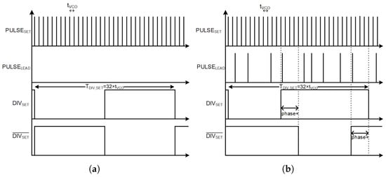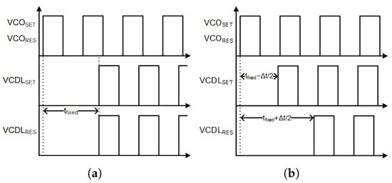 In prior articles using time-based control for DC–DC converters, the VCDL is used to generate the proportional phase gain [,,,,,,]. The VCDL generates a phase difference between the and frequencies by applying a time delay to both signals with a difference in delay in proportion to the voltage error between and , using a chain of current-starving inverter cells, controlling the propagation delay between frequency input and output. Figure 5 shows the input-to-output effect of the differential VCDLs on the VCO signals with and without an error voltage. A fixed time delay is universally applied to both VCO frequencies in both cases, where a delay error of between the frequencies is generated in response to some positive voltage error by delaying by , and delaying by . The fixed delay bounds the phase gain of the VCDL, where the maximum possible delay error between the VCO frequencies is