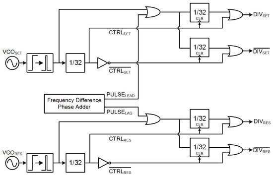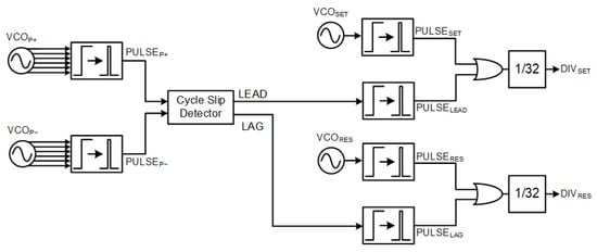 Figure 11 depicts the selector used to allocate the and to the frequency dividers for the base or complementary signals. An initial pair of divide-by-32 frequency dividers using only the and generates and control signals and their respective complementary signals. Another four frequency dividers, using both the VCO and cycle slip detector pulses to perform frequency division, are controlled by the control signals. Taking the set signals as an example, while is high, the divider it controls is cleared, setting its output to low and barring it from counting any pulse. In the meantime, is low, thus allowing it to accept either the or signals, allowing it to start counting pulses up to 16. Once the total pulses from either add up to 16, is able to flip to high as the divider output goes high, and it remains high as goes high to clear the divider output for due to the OR gate. It goes low only when switches back to low, re-enabling the divider for to resume counting pulses. The reset signals would operate similarly, with generating and as control signals through the primary frequency divider, controlling the secondary frequency dividers that pull the and signals forward based on and pulses.