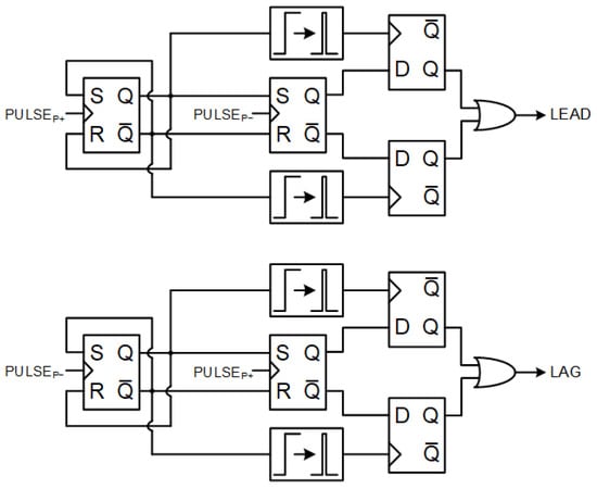 Figure 8 shows the model of the frequency difference phase adder (FDPA) circuit for proportional response gain. A pair of VCOs, and , are identical to the integral/current loop VCOs. In this circuit, all 12 oscillator clock phases of the six-stage phase adder VCOs are used, converting their rising edges to pulses and compared in the cycle slip detector circuit, seen in Figure 9. The cycle slip detector consists of two sets of four D-latches, which are tasked with detecting when the phase difference between and goes above radians or under radians, resulting in a LEAD or LAG signal being produced for each, respectively. LEAD swings to high whenever at least two simultaneous pulses are detected after one pulse before the next one is detected, while LAG swings to high whenever at least two simultaneous pulses are detected after one pulse is detected instead. In the case of the phase adder, the cycle slip detector is used on all 12 phases of the VCO stages, effectively checking for phase differences exceeding the radian to radian range instead. Following the detection of a LEAD or LAG signal, a pulse is generated to be added to the frequency divider corresponding to or , respectively, producing the and signals, with a center frequency of 1 MHz after frequency division.