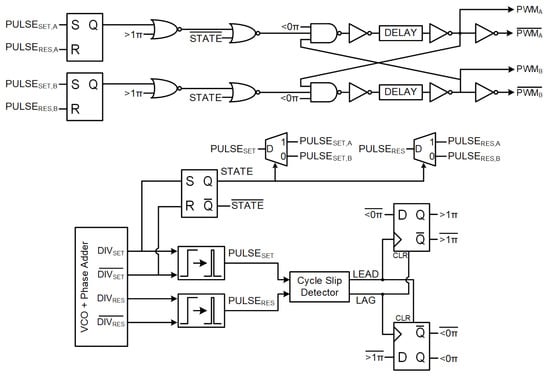 For the second task, the cycle slip detector from the phase adder circuit is once again used, this time to detect the phase difference between the and signals to ensure they do not exceed the range. Figure 13 shows the phase detector outputs of a typical phase detector in (a) alongside this NOASPD in (b). In typical phase detectors, when the phase difference between and goes below 0 radians or above 2 radians, the phase detector loops around to the other side to 2 radians and 0 radians, respectively. This would destabilize the PWM controller for the DC–DC converter, which relies on the accurate tracking of overall phase difference regardless of cycle slip. In addition, for the DSD buck converter, phase difference cannot exceed even , since the PWM generated for either sub-converter would overlap. Hence, the NOASPD has a cycle slip detector with pulsed inputs of the rising edges of both base and complementary signals of and , such that a slip detected would indicate phase difference exceeding radians.