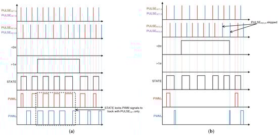 Figure 14 depicts the cycle slip detector and pulse allocation for both radians and radians cycle slip conditions. In (a), as two simultaneous are detected before the next , the phase difference exceeds radians, setting to high, which locks and signals to and frequency, ensuring a maximum phase difference of radians between them. As the frequencies converges and the phase difference recovers, two simultaneous are detected before the next , setting back down to low and PWM signals return below radian phase difference. Conversely, in (b), the two simultaneous detected before the next indicate phase difference slipping below , setting to high and stopping PWM signals from propagating altogether. After some time, two simultaneous are detected before the next , indicating phase difference recovery, setting back to low, and PWM signals to propagate again.