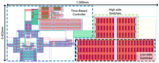 This circuit is simulated in 130 nm BCD process in Cadence Virtuoso, with the time-based controller designed in the 1 V low-voltage domain and the power switches operating at 10 V . The power stage is simulated, with layout parasitic data extracted for the low-voltage domain controller and the DSD power stage switches, while the output filter is modeled using two H inductors with 12 m DC resistance for the two sub-converter stages, a 22F output filter capacitor with 20 m equivalent series resistance, and three resistive voltage dividers of 50 k each, dividing the , , and by 10 for the VCO feedback. The active area is 1.068 mm × 0.402 mm, or 0.412 mm2, as shown in Figure 15.