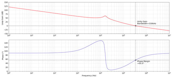 Figure 17 shows the frequency response of the unified DSD buck converter control loop. The control scheme used provides a unity gain bandwidth (UGBW) of 330 kHz and phase margin of 55.5 at .