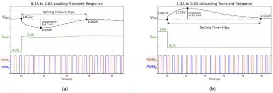 Simulated 1.8 A loading and unloading transients. (a) UP 0.2 A to 2.0 A; (b) DN 2.0 A to 0.2 A.