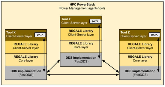 In this section, we present the REGALE Library which is the result of a joint effort among the REGALE project partners to design an interoperability layer for distributed power management in large-scale HPC systems. The purpose of the library is the creation of a standardized interoperability layer among all the tools involved in the HPC PowerStack. As such, every component interested in using it should just be coherent with its standard, respecting the declarations of its APIs and the definitions of the callbacks needed for the server side of the client/server APIs layer. Figure 2 depicts the software structure of the REGALE Library and its key components. From the bottom up, the REGALE Library is based on DDS functionalities, which are wrapped and made easy to use by the core layer. This part is responsible for the management of the publishers and subscribers as well as everything related to communication, features, and optimizations. In particular, DDS entities expose APIs that are uses from our regale core layer. This layer can instantiate DDS entities and manage it and expose higher-level features to the client/server layer. The main purpose of this last layer is to provide the common API for all the HPC PowerStack agents involved in the HPC power management ecosystem, which need to exchange information and interact.