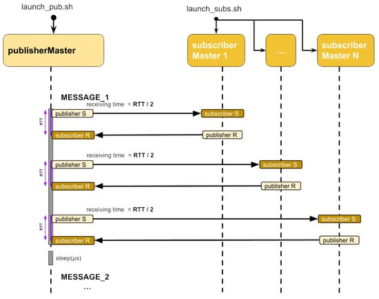 In this test, we instantiated an increasing number of DDS actors on single G100 compute nodes. Thus, we leveraged ad hoc jobs, submitted with the default batch scheduler (SLURM []), each instantiating, configuring, and executing a set of entities (DDS Publisher, DDS Subscriber) proportional to the allocated nodes. These entities are capped to a maximum of 40 for each compute node to avoid perturbation in the characterization results due to saturation effects. As shown in Figure 4, each message is exchanged from one publisher (publisherMaster) to N subscribers (subscriberMaster_N). Upon receiving a message, the subscriberMaster replies, sending back a message to the publisherMaster. Message latency is computed as half of the round-trip time, which is measured as the time interval that occurs between the publisherMaster sending the message and receiving the answer. The time interval is measured only at the publisherMaster side to avoid accounting for time drifts in different node clocks. The test is replicated by configuring the FastDDS middleware with the different supported transports: UDP, UDP Multicast (UDPM), shared memory (SHM), and TCP. For each configuration, we compute the average round-trip time as described in Figure 4 over 10K messages.