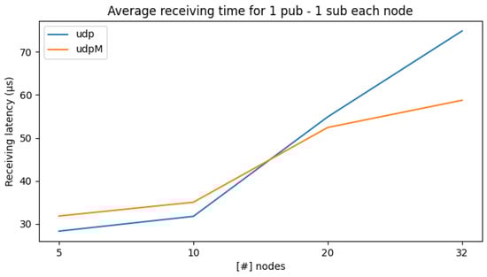 Figure 5 shows on the x-axis the number of nodes and on the y-axis the average latency (in μs) for the exchange of messages while increasing the number of subscribers that will match the number of nodes. First, we can see that the average latency for receiving a message increases with the number of nodes, and UDPM pays off for a larger number of entities. Moreover, when comparing the results in Figure 5 with the one reported in Table 2, we can notice that the average latency increases as an effect of the higher communication time the network interface takes. Still, for a single message, we are in the tens of μs time range.