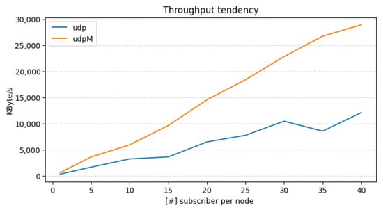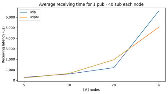 In Figure 6, we extended the previous test by incrementing the number of per-node subscribers to 40 to significantly increase traffic and observe the system’s behavior as it scales. The time reported in the plot refers to the latency for a single message. As we can see from the figure, the latency grows exponentially for UDP and quasi-linear for UDPM. The highest time is reached with 2560 ( Figure 4) FastDDS entities that exchange messages with each other.