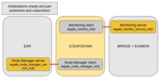 Figure 8 depicts the initialization phase of the prototype HPC PowerStack based on the proposed implementation of the REGALE Library. It includes the initialization for both the implementation of the client and the server sides, respectively, the client for COUNTDOWN and the server for EAR and the BRIDGE + EXAMON. The publishers and subscribers are initialized and paired: the xxx present in Figure 3 for the Client/Server layer methods are now replaced by the corresponding entities names: NM and monitor.